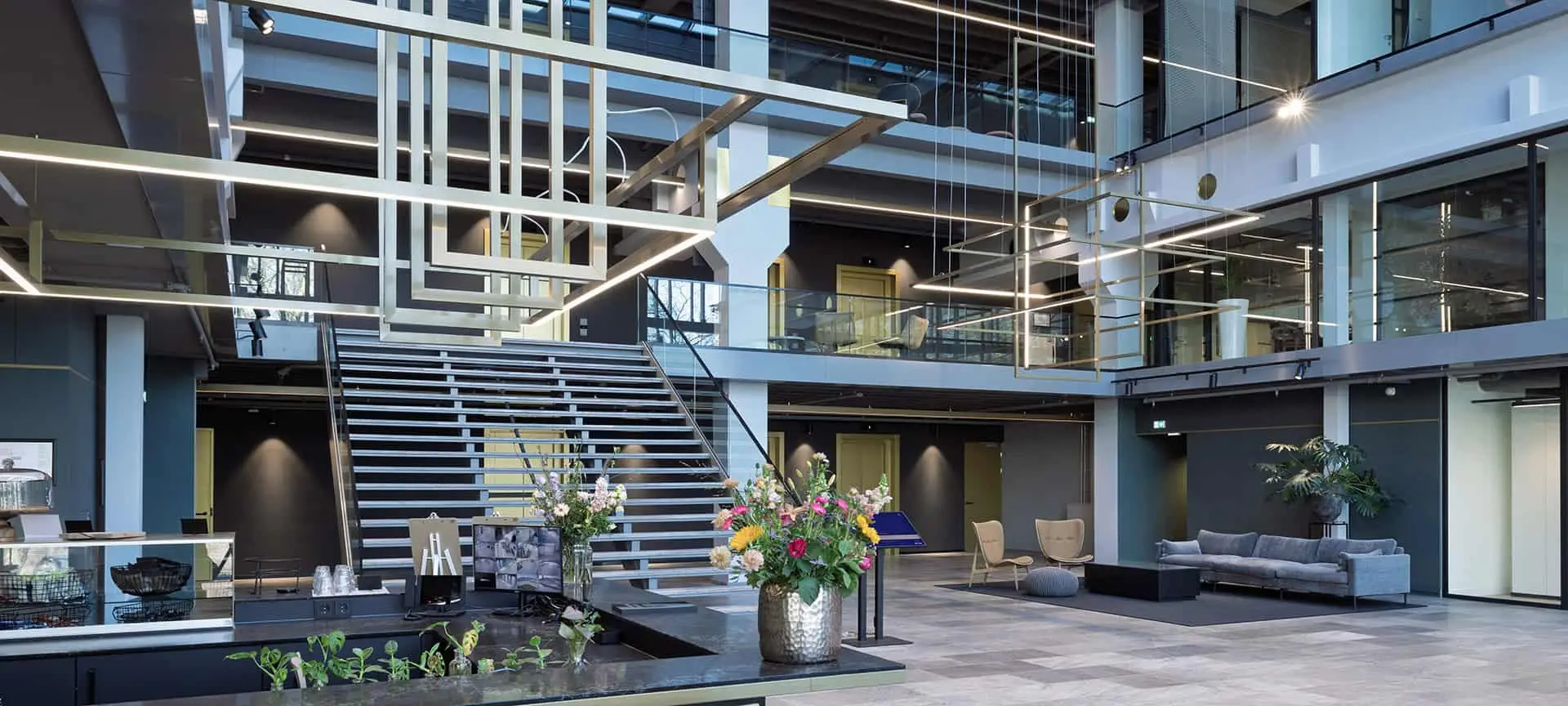 In de gangzone op de begane grond zijn Rekta 30 maatwerk profielen van Multiline toegepast die het lijnspel van de ruimtes mooi accentueren. Zoals op de foto’s te zien is er gebruik gemaakt van de Intra Lighting Wave armaturen die mooi meeloopt met de vorm van de gangzones. In de treinopstelling hangt de Valentina van Bover en als tegenhanger hangt het Intra Lighting Lynar profiel in het directiekantoor, om zo verschillende stijlen en prijsklasse te weergeven.